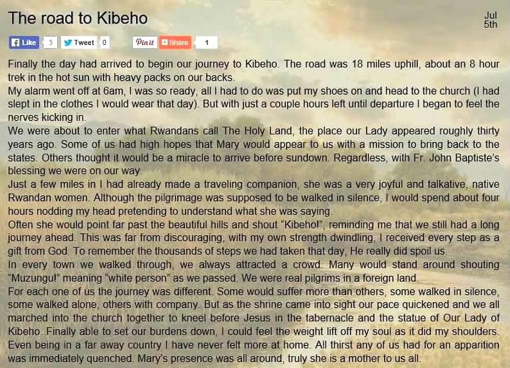 Alana, really taking that to heart began her trek to Kibeho. It didn’t take long for Alana to find a friend. A Rwandan woman claimed her as a walking partner to Kibeho, and although Alana could not speak the language she smiled, nodded and laughed as they headed to Our Lady’s homeland. Alana started to get pumped as every so often the woman would point and shout KIBEHO KIBEHO. Just being in Alana’s presence without being able to speak our language- or us-theirs- describes the very person of Alana. Her language was silent love. A little one. Read Alana’s own words: