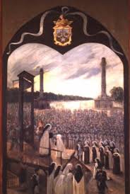 “Who?” (I still repeated to myself). Soon thereafter, Mother put the book entitled “To Quell the Terror” in my hands. The book cover in itself was somewhat striking: a large red cross and in its shadow a number of Carmelite nuns laying face down with their arms outstretched, also in the form of a cross. Hundreds of Catholic lives were sacrificed by the guillotine during the unforgettable French Revolution, but what made Mother Teresa of Saint Augustine and her community of martyred nuns so different? I began reading the book and immediately their powerful story unfolded. One of Mother Teresa’s nuns had found a document in the monastery archives of a vision that was written down by a sister who had lived in that very convent with other nuns during an earlier time. If I recall, the discovered document was fifty to one-hundred years old, written long before Mother Teresa and her daughters had established themselves in that very same building.