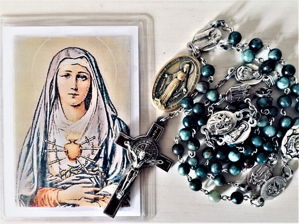 A few weeks later when I was back at my apartment in the States I received a package in the mail; it was from my grandparents. I took it over to the Catholic Church I conveniently lived right across the street from and made it to Mass a little early so I had time to open it in the presence of the Blessed Sacrament ( it was providence I received such a gift in front of Our Lord). I opened the box to find an image of Our Lady of Seven Sorrows staring at me with a list of Her seven promises on the back; underneath that image was one of those moments when we realize everything happens for a reason; there are no coincidences with God. I pulled out a strand of beads with a little note that read “African Jade Beads- Seven Sorrows Rosary”. Not only am I named Jade but the beads were from Africa. Sitting in that pew, I had not the slightest idea that a few years later I would be named after Our Lady of Seven Sorrows as a Carmelite nun with Her September 15th feast day- a name or feast that I did not choose (but very much wanted) as we were not allowed to make any suggestions, the Mother Prioress did all of the decision making in that department.