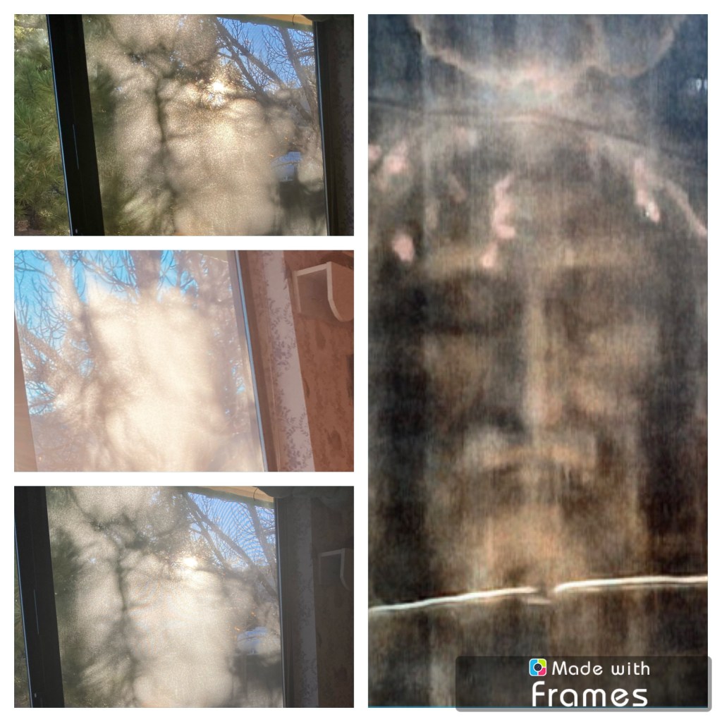 Maybe my eyes are merely playing tricks on me, but just the other day I was learning more about the Shroud of Turin. This morning as the sun was rising through my window I happened to look up and see what appeared to be an outline of a face; the branches that created a shadow on my window seemed to form a perfect crown of thorns. I also was struck by how in the image of the shroud His eyes appear to be closed or cast down, which is what it looks like in the window image. It’s moments like these where I believe Our Lord likes to give His little children hints that He is always near…