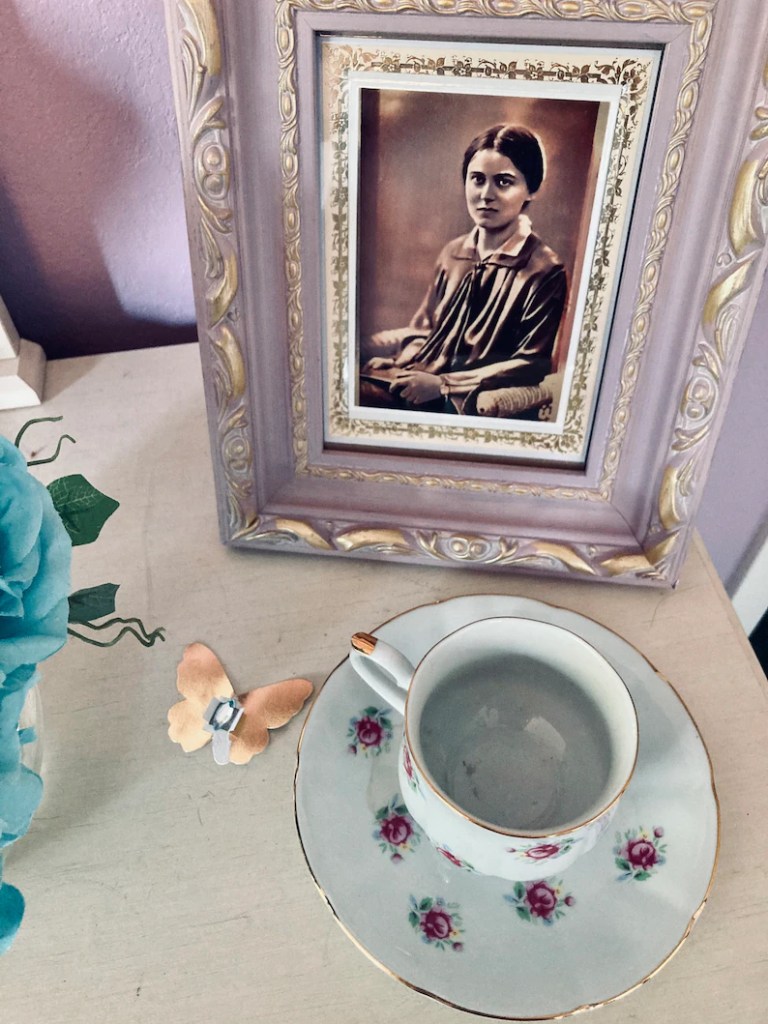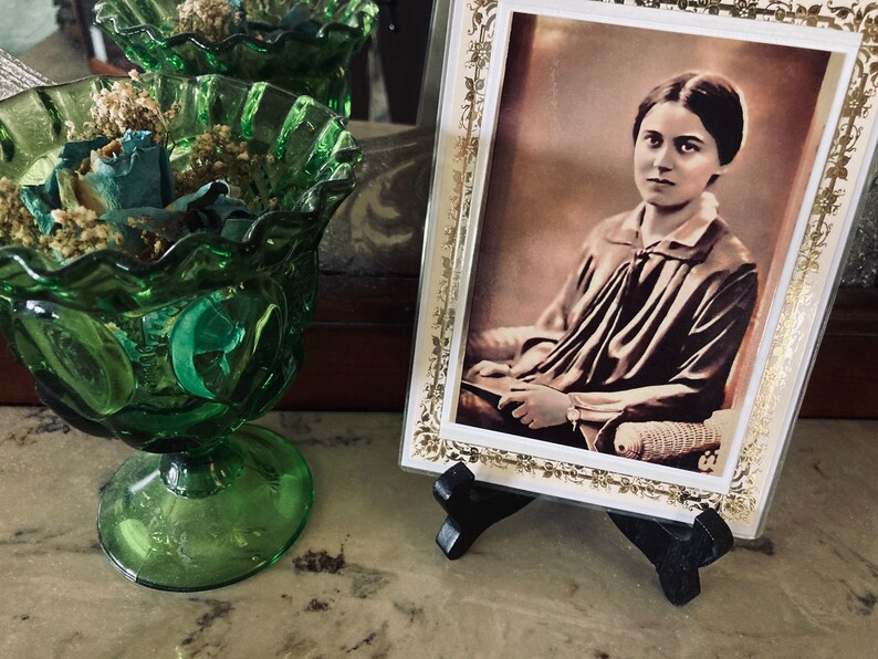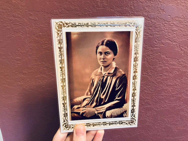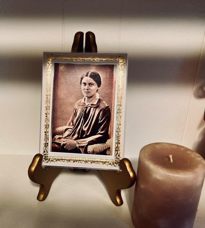 Beautiful gold border of Saint Benedicta of the Cross (Edith Stein) before Carmel. Image has a pearl shimmer and thin laminated coat protector. All set up to frame as it comes matted. 4.8X6.5.
