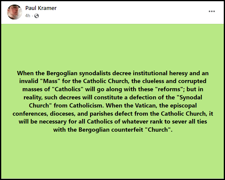 “Dear True Resistance, the formal schism is coming where the conciliar church (now morphing from a heretical to an apostate church) will be cut out of the Catholic Church like a cancer. Know that the current head of the conciliar church is not Benedict XVI; it is Jorge Bergoglio. For those of the True Resistance who accept Jorge Bergoglio as pope, know that you inadvertently accept the head of the conciliar church as being the head of the Catholic Church. In reality, we are no longer in a situation with one pope and two churches; rather, we are now in the situation of two popes and two churches. The successor of Benedict XVI will lead the Catholic Church. You claim that you want nothing to do with the conciliar church. Here is your opportunity to disassociate yourself from it by rejecting its current head. What will you decide?“